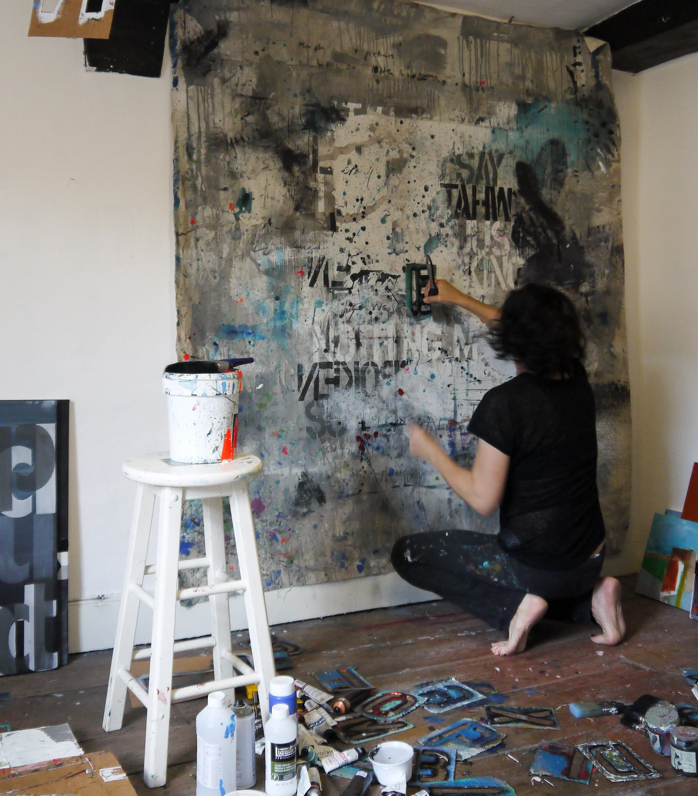 Niki Hare is a self-taught artist whose paintings reveal words of emotional honesty. She describes her word paintings as “writing themselves with no restraint.” Hare’s method of working involves layering paint and scraping back the layers to form textures. These layers and textures create a surface that seems to breathe life into the messages that are laid out before us.